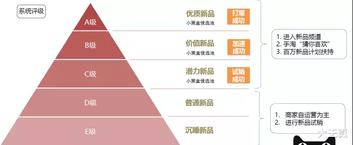 再往上是C级潜力新品,试销成功就可以,并且小黑盒大概率可以入候选池,B级必须是加速成功的新品,这是比较有价值的产品,A级是最厉害的优质新品,小黑盒100%能入池,而且已经算新品打爆成功了。