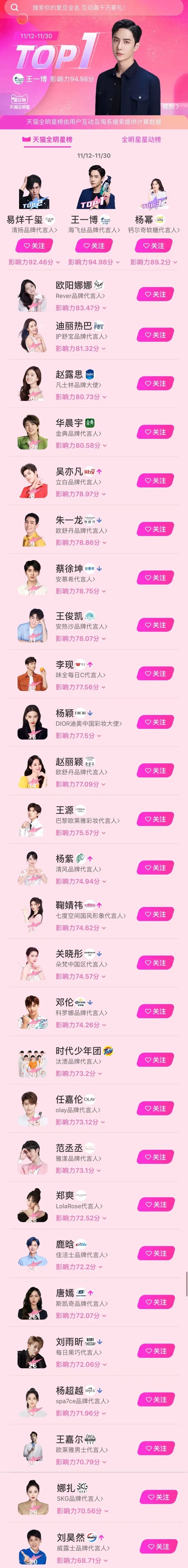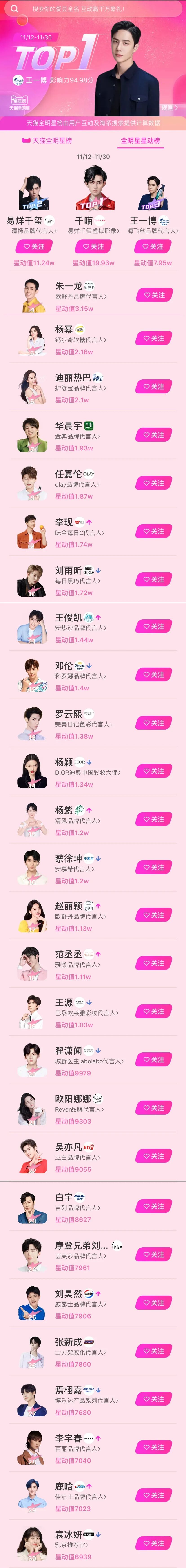 「天猫全明星榜」最新统计周期为 10 月 26 日至 11 月 11 日,活动周期覆盖整个双11,这份榜单可以说极具试金石属性,榜单排名,是对各大明星的商业影响力和带货力的如实呈现。