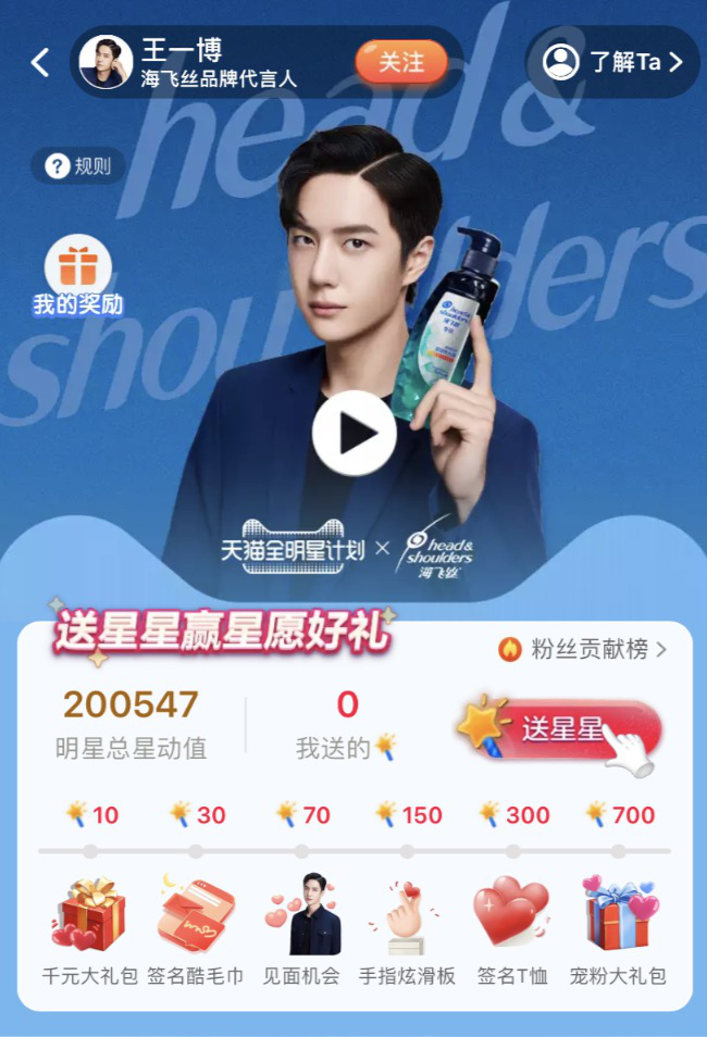 品牌用户或者明星粉丝,打开手机天猫、手机淘宝,搜索任何一个明星的名字,即可直达该明星的专属许愿池,通过送星星许愿互动赢心愿好礼。