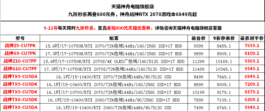不仅是神舟 战神TX9系列,战神全系列都有促销活动,这边有一张表格,供大家参考价格: