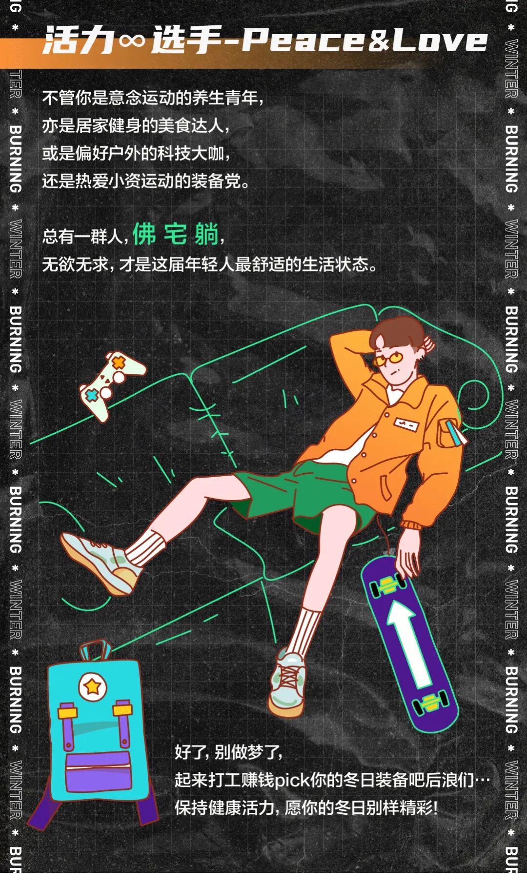 不同于其他严肃报告,这份趋势报告以Z世代的萌趣语言来展现Z世代的立体生活,但背后又是对年轻人运动行为和泛运动场景的深刻洞察。如根据当代年轻人的不同运动习惯,提炼出“意念健身”“宅家律动”“小主配齐”“极限贵族”等趣味标签,让年轻人自觉对号入座,产生“没错,这就是我本人了”的代入感。 与此同时,这份趋势报告又打破固化场景,以更加鲜活真实的细分生活场景,串联起冬季运动品类及相关趋势品类。