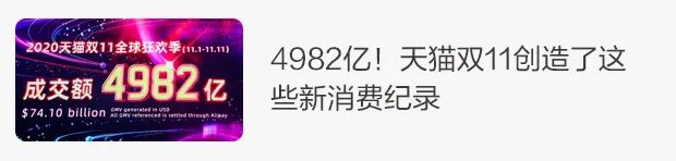 4982亿成交!2020年天猫双11全球狂欢季,创下又一个新消费纪录。成交破亿的品牌达到474个,其中60%的品牌增速超去年同期。