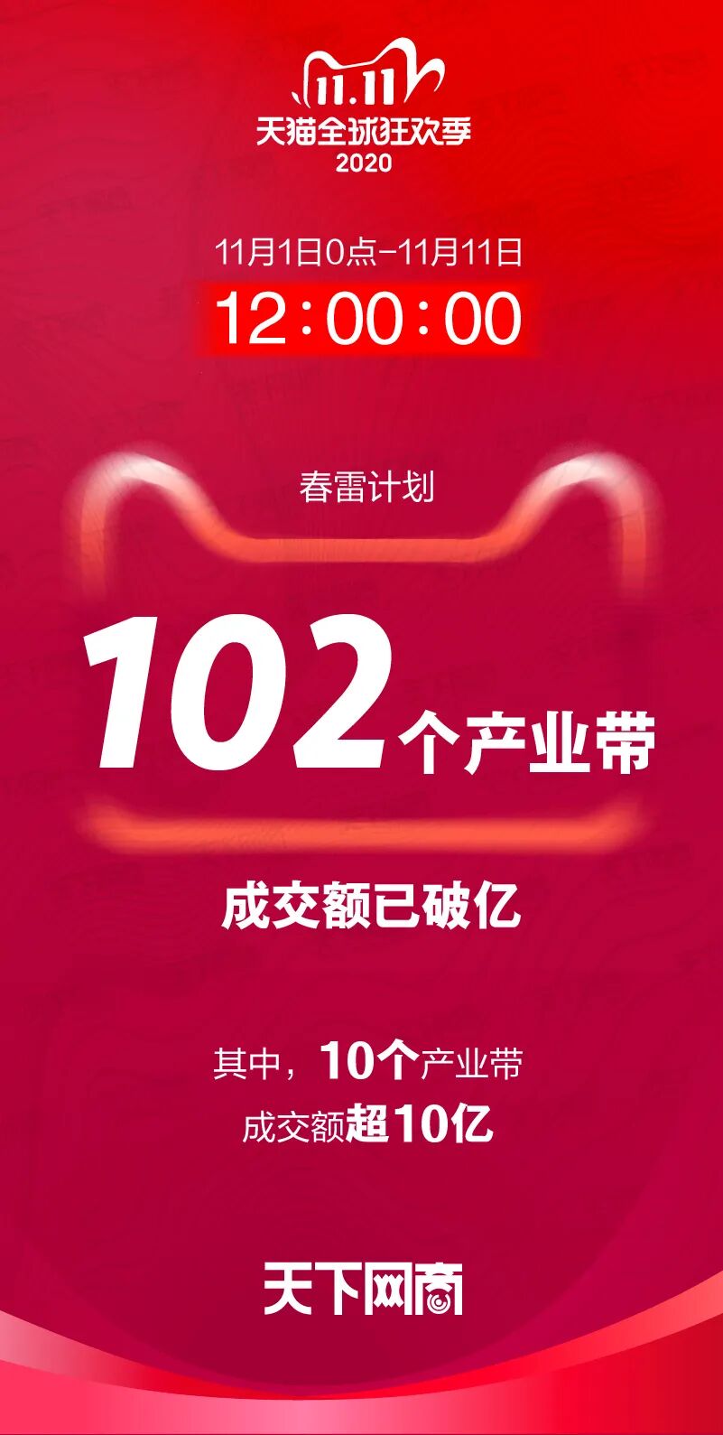 11月1日0时至11月11日12时,2020年天猫双11全球狂欢季已经诞生了102个成交额破亿的产业带,其中超过10亿元成交额的产业到有10个。