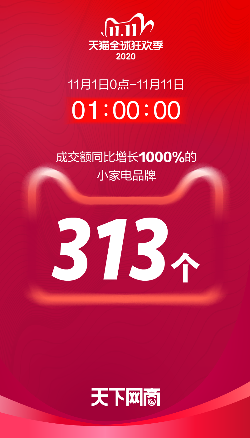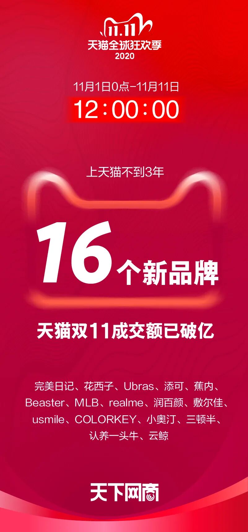 天猫双11正在见证新品牌崛起。从11月1日到11日中午12点,已有16个新品牌在天猫双11累计成交额突破1亿元,数量接近去年的3倍,而且这个数字还在增长!