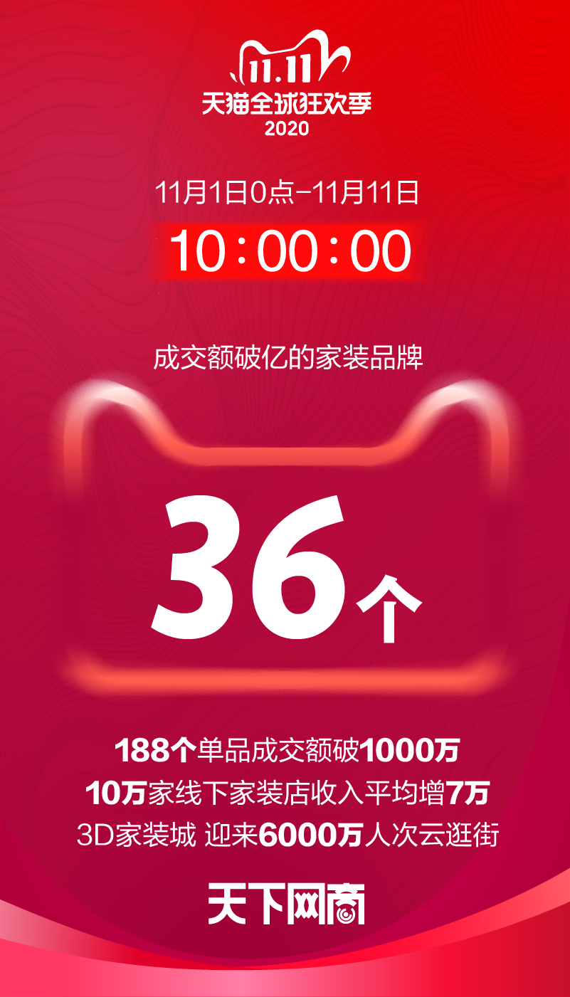 11月1日至11日10点,100层的“天猫3D家装城”里迎来6000万人次“云逛街”。天猫家装累计诞生188个成交额破1000万的单品,林氏木业、全友家居、源氏木语、索菲亚、欧派、喜临门等36个品牌成交额突破1亿元,创造了家装行业今年以来的增长峰值。