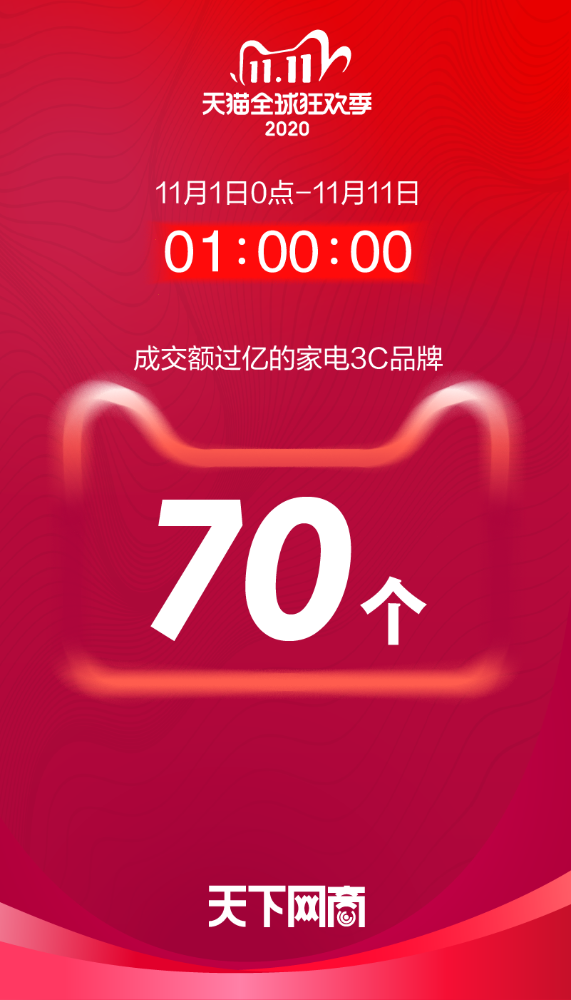 11月1日至11日1时,苹果、华为、美的、海尔、格力、小米、戴森等70个家电3C品牌天猫双11成交额过亿。消费者最青睐的是国货品牌,家电3C行业成交破亿名单中超8成是国货。