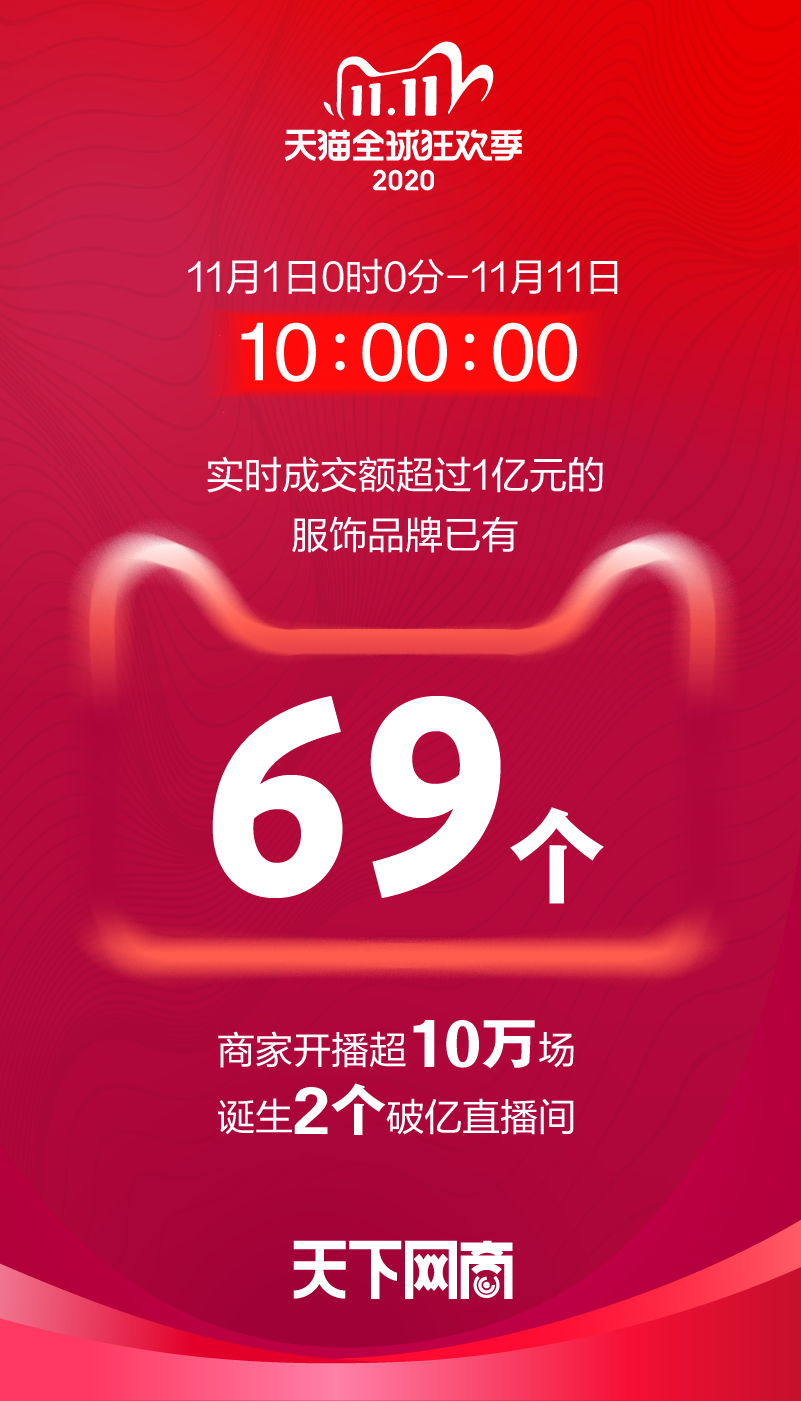 淘宝直播为服饰商家提供了增长新动能。双11期间,服饰商家累计开播场次超过10万场,阿迪达斯和波司登店播成交额破亿,61个服饰品牌店铺直播成交额破千万,创造了新纪录。