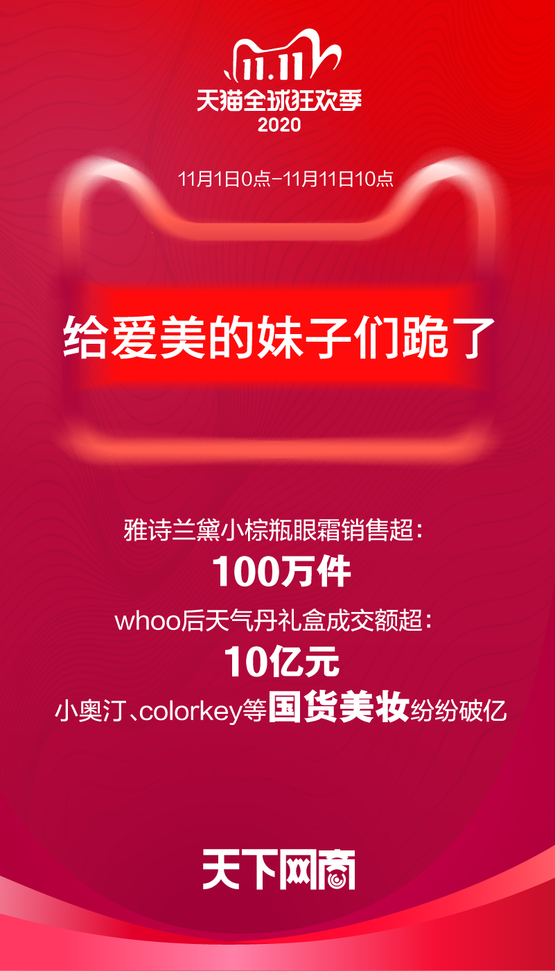 今年天猫双11,美妆大牌全力押宝中国市场,给出“比免税店还便宜”的优惠力度,吸引了“尾款人”汹涌抢购。雅诗兰黛在11月11日零点1分,成为首个天猫美妆突破20亿的品牌旗舰店。小棕瓶眼霜累计销售突破100万件,成为全网销量最高的眼霜。韩国品牌Whoo后的“天气丹花献礼盒”累计成交额突破10个亿,成为全网销量最高的单品!