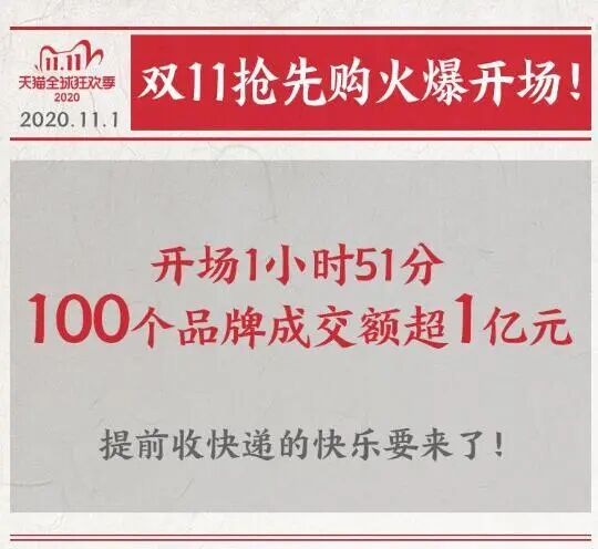 开场1小时51分钟,已有阿迪达斯等100个品牌成交额突破1亿元,预计11月1 -2日两天内将有1亿人收到货,剁手党们提前拆快递的快乐要来了!