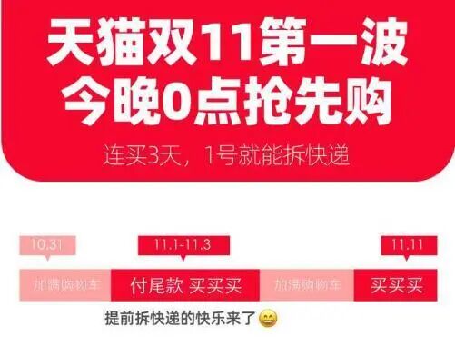 今年天猫双11从“光棍节”变成“双节棍”,消费者可分两波购买,双11比往年多了3天,11月1日-3日就可以第一波付尾款,11月11日为第二波。消费者1号开始就能收快递,提前10天享受双11拆快递的快乐。