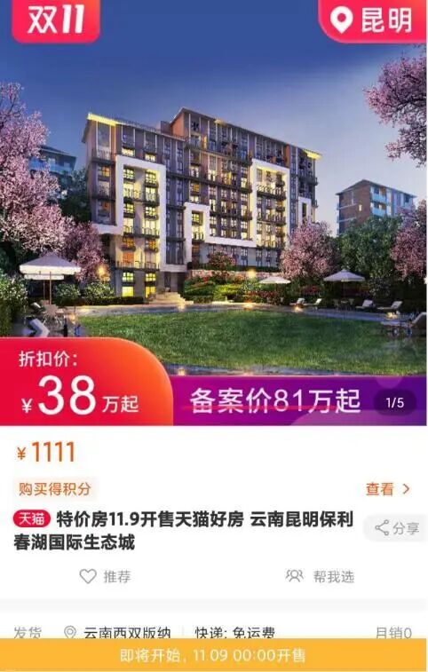 在5折秒杀的活动中,云南腾冲、西双版纳、昆明等地的一些房源都有出售。时间从11月1日-9日零点开始,5折开售。其中昆明的一套房源显示:11.11元购券放款最高立减71万元;在天猫好房的双11捡漏专场西双版纳房源备案价70万起,秒杀价39万起,昆明备案价81万起的房源将在9日进行秒杀,折扣价38万起。