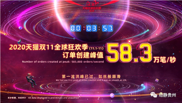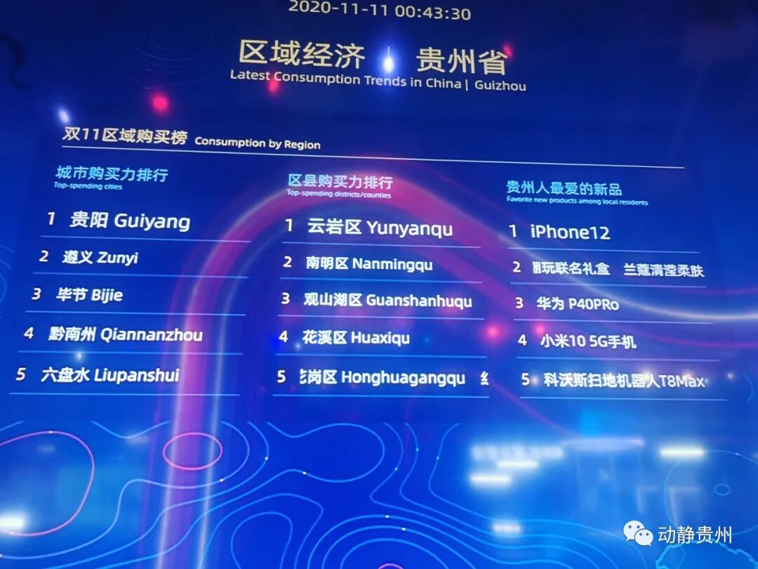 今天(11月11日)凌晨,在2020年天猫双11全球狂欢季现场,应动静记者的要求,主持人在会场发布了贵州双11的实时数据。
