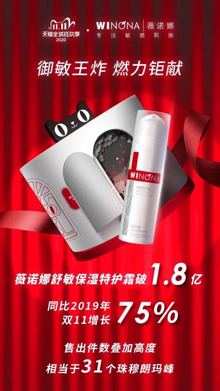 在天猫双11第一波中,薇诺娜就创下10秒售空8万套礼盒的销售奇绩,而在第二波期间,两大爆款产品,舒敏保湿特护霜和舒敏保湿修护精华液,销售额比去年同期分别增长了75%和156%,清透防晒乳同比增长409%,年度黑马产品舒缓修护冻干面膜卖出136.9万片!