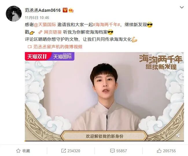 《引爆点》有一个“个别人物”法则:“一个信息想要流动起来,必然要经过某些特殊人物的社交能力、活力、热情和魅力传播出去。”天猫国际邀请品牌代言人兼海淘文化传承官范丞丞、宋茜,通过微博发声、视频站台的形式,号召大众一起传承海淘精神、守护海淘文化。