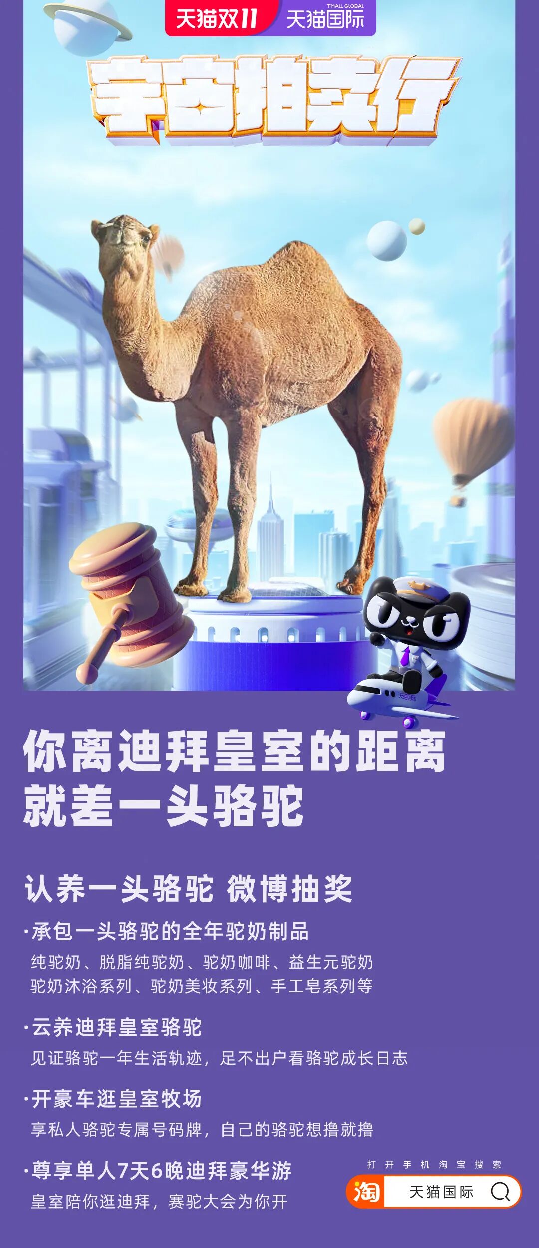 与此同时,宇宙拍卖行还提供了两大独具一格的拍品。其一,认养一头骆驼,即可云养迪拜皇室骆驼、体验皇家牧场溯源模式,分分钟开启人生巅峰模式;其二,拍卖一亩酒庄,即可获取法国酒庄主理人的身份、拥有与宋茜共同经营酒庄的权益,得到全年氤氲梦幻的体验。