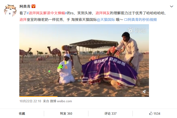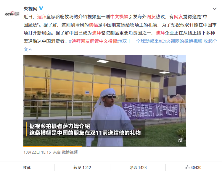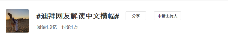 在传播层面,天猫国际在微博阵地发起了#迪拜网友解读中文横幅#的话题,借助“外国人视角下中国魔法”的趣味感与猎奇属性,引发大众关注与讨论,实现传播的冷启动。