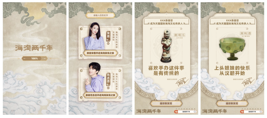 为了扩大传播的趣味性和参与感,天猫国际推出一支趣味互动H5,结合两位明星的语音讲解,透传海淘古物的内涵与核心信息。