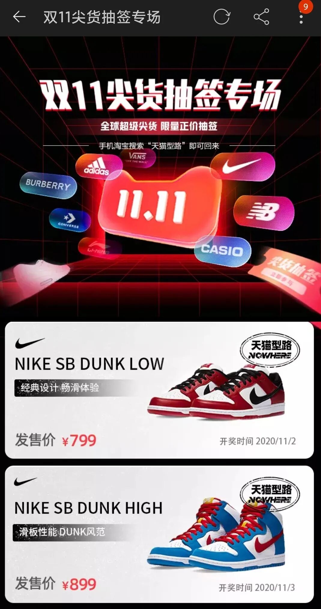 还记得前两天参与的Nike SB Dunk芝加哥+哆啦A梦吗?11月1号开始的还只是蹭蹭玩一玩!双11当天才是刺激的重头戏!