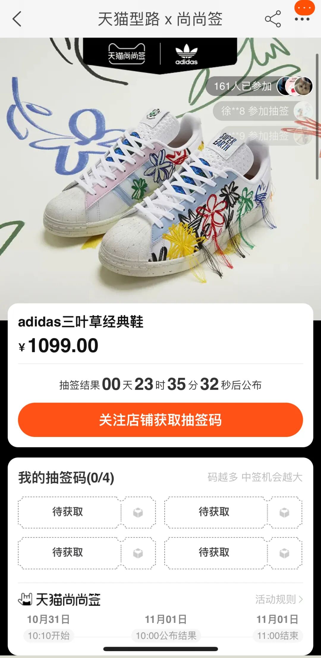 上周adidas的旗舰店联合了天猫做出了抽签活动,也就是11月1日开奖(正如上图所标识的)。